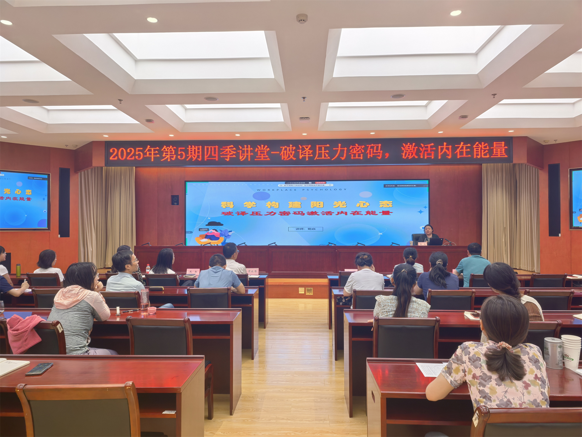 為幫助干部職工科學(xué)認識壓力、掌握調(diào)適方法、培育積極健康的陽光心態(tài),提升工作效能與生活幸福感,我院工會于7月15日舉辦2025年第5期四季講堂,邀請資深心理咨詢師、培訓(xùn)師,首都科學(xué)講堂公益大使荀焱老師,以“破譯壓力密碼,激活內(nèi)在能量”為主題作專題輔導(dǎo)報告,各部門干部職工參加。