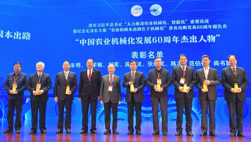 會議表彰了在我國農業機械化60年發展過程中做出重要貢獻、產生重大影響、示范引領作用突出的60位“中國農業機械化發展60周年杰出人物”,他們分別來自于農業機械化和農機裝備產業教學、科研、生產、經營(銷)、管理、檢測鑒定和推廣應用等領域。我院原院長胡南強,原院長、現首席科學家朱明,副院長趙立欣獲此殊榮。